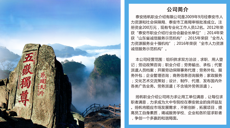 泰安揚帆職業(yè)介紹有限公司是2009年9月經(jīng)泰安市人力資源和社會保障局、泰安市工商局審核批準成立。注冊資金200萬元,現(xiàn)有專業(yè)化工作人員12名。2012年榮獲“泰安市職業(yè)介紹行業(yè)協(xié)會副會長單位”;2014年榮獲“山東省誠信服務示范機構(gòu)”;2015年榮獲“全市人力資源服務業(yè)十強機構(gòu)”;2016年榮獲“全市人力資源誠信服務示范機構(gòu)”。